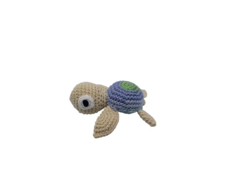 Χελώνα εκρό με γαλάζιο κέλυφος, φτιαγμένη απο υποαλλεργικό νήμα 55%βαμβακερό και 45%ακρυλικό, περίπου στα 12 εκατοστά μάκρος.Πλένεται στο πλυντήριο ή στο χέρι στους 30 βαθμούς.