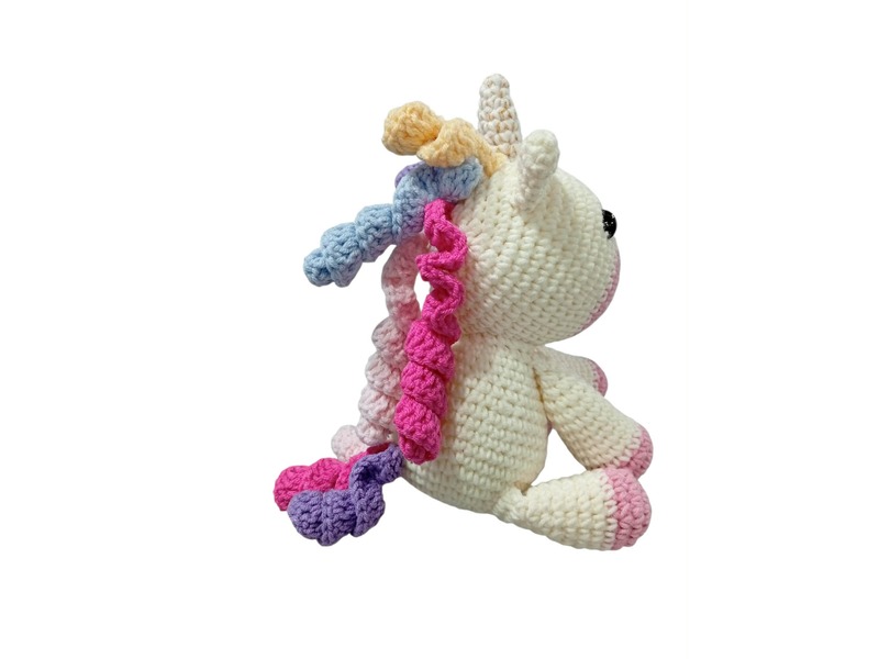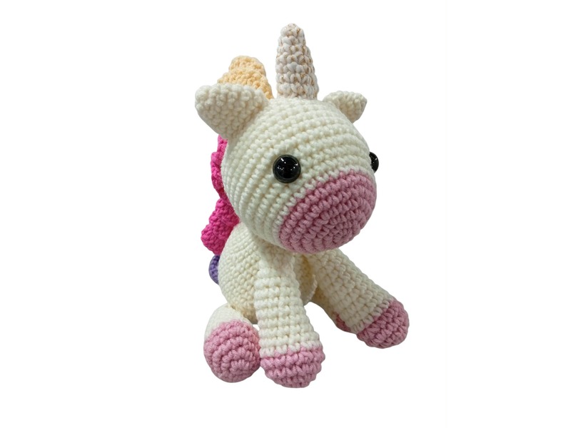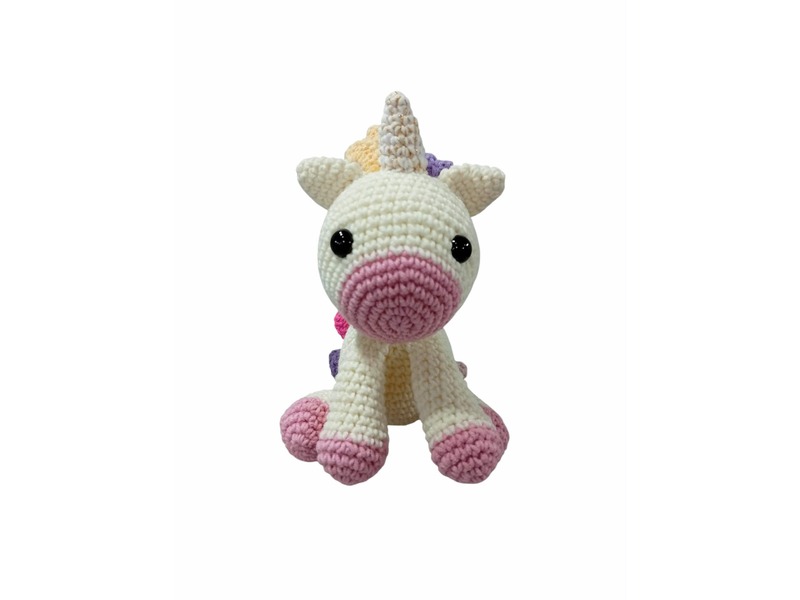 Εκρού μονόκερος πλεγμένος απο υποαλλεργικό νήμα 55% βαμβακερό και 45% ακρυλικό.Πλένεται στο χέρι ή στο πλυντήριο στους 30 βαθμούς.Το ύψος του είναι στα 15 εκατοστά σε καθιστή θέση.