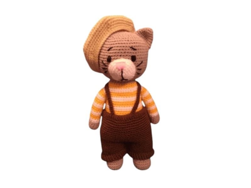 Γατούλης με μπερέ και παντελόνι αποσπώμενα απο το σώμα, φτιαγμένο απο υποαλλεργικό νήμα, περίπου στα 30 εκατοστά.Πλένεται στο πλυντήριο ή στο χέρι στους 30 βαθμούς.
