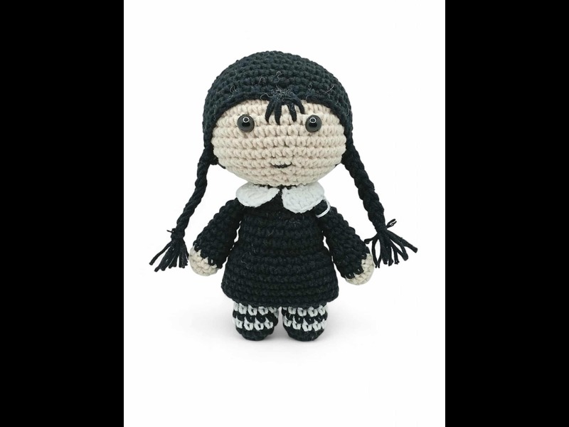 Κούκλα τύπου “Wednesday” με μαύρο φόρεμα, πλεγμένη με  νήμα 55%βαμβακερό και 45%ακρυλικό.Υψος περίπου 17 εκατοστά.Πλένεται και στο πλυντήριο στους 30 βαθμούς.